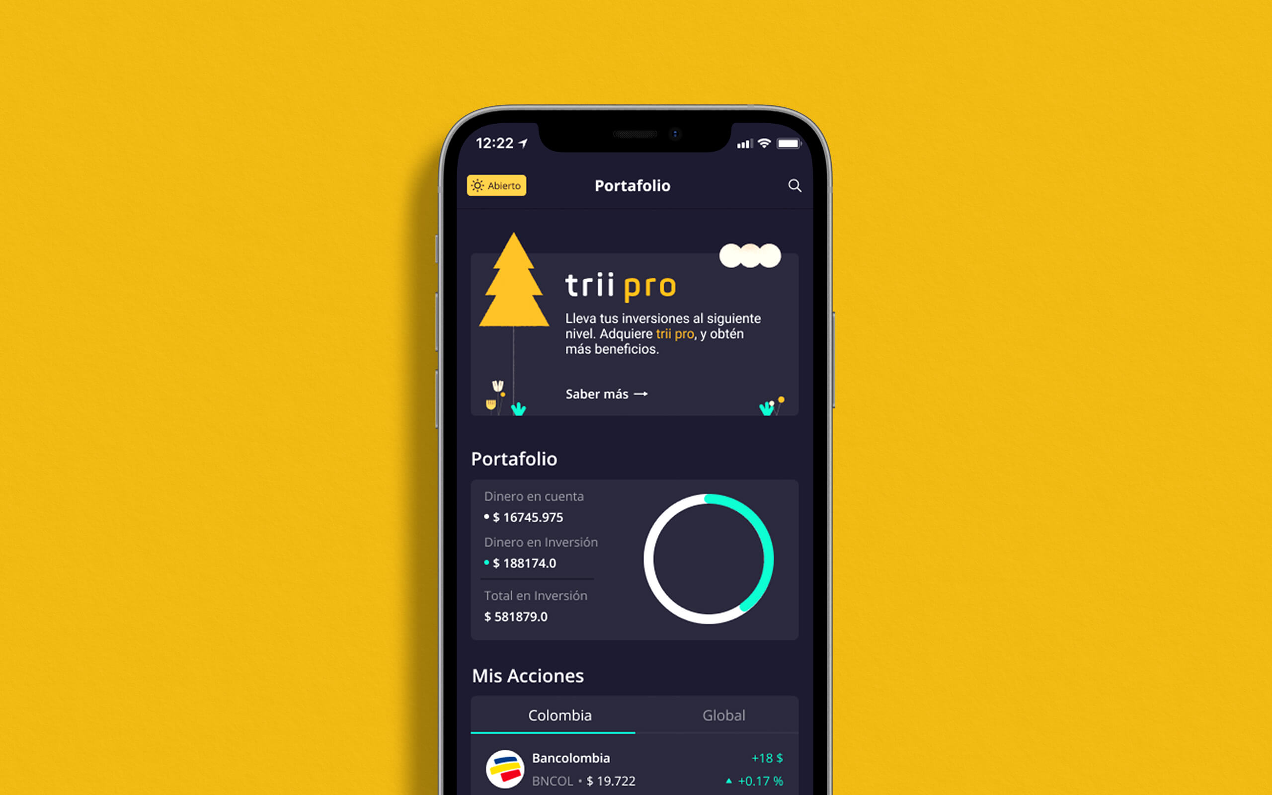 Diseñamos la primera versión de la aplicación con un enfoque centrado en la experiencia de los usuarios iniciales: una interfaz clara, moderna y segura, pensada para generar confianza en cada paso del proceso de inversión. Esta primera versión permitió a Trii ganar tracción en el mercado colombiano y presentar un producto sólido ante inversionistas, incluyendo su ingreso a Y Combinator.