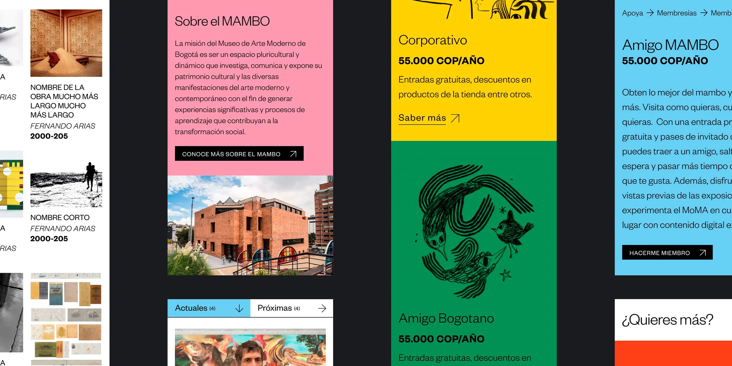 El Museo de Arte Moderno de Bogotá había rediseñado su marca en 2020 con la ambición de competir con los mejores museos de arte de América Latina. Pero el lado digital no había seguido el mismo ritmo. No existían reglas claras para aplicar la nueva marca en línea, la creación de contenido era un problema constante para el equipo del museo, y el resultado era un sitio desorganizado, con elementos desconectados y una experiencia de usuario confusa. El reto era construir un sistema digital capaz de soportar todo lo que el museo produce regularmente, desde exposiciones y eventos hasta programas educativos y su colección permanente.